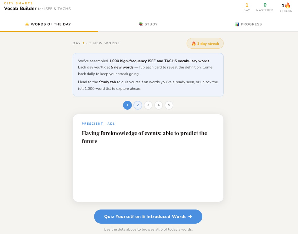 Vocab Smarts is a free vocabulary study tool built around 1,000 high-frequency words drawn from ISEE and TACHS prep materials. It lives on the City Smarts website and requires no login — just open it, and start learning.